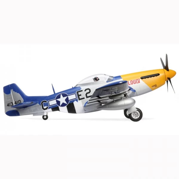 Le P-51D Mustang 1.5m est la réplique la plus grande, la plus détaillée et la plus performante du combattant légendaire d’E-flite®! En plus des formes précises, il présente également une abondance de détails maquette supplémentaire, notamment des lignes et des écoutilles moulées, des canons et des réservoirs amovibles, ainsi qu’une finition «Lou IV» appliquée en usine. Les caractéristiques fonctionnelles supplémentaire comprennent des feux de navigation à LED, des portes séquentielles de train principal et de roue arrière, des volets et plus encore. Les jambes de train suspendues comportent des roues équipées de roulements à billes avec des pneus à sculpture diamantés pour une allure encore plus maquette et permettent de voler à partir d’une variété de surfaces, y compris l’herbe, et des mécanismes électriques fiables actionnent le train principal et la roue arrière. Et au cœur de tout cela est un moteur brushless installé en usine qui est compatible avec la puissance 6S LiPo – il suffit d’ajouter une batterie 6S 3200-7000mAh pour atteindre des vitesses de vol à niveau supérieures à 130 km/h et des performances verticales illimitées! Les deux versions incluent un contrôleur brushlmess Spektrum ™ Avian ™ Smart de 100 ampères, et la version BNF® Basic est également équipée d’un récepteur AR637TA qui offre une télémétrie complète, y compris la tension, le courant, la température et plus de la batterie en temps réel aux émetteurs compatibles, plus les avantages des technologies exclusives AS3X® et SAFE® Select pour en faire l’une des Mustang les plus faciles à piloter de tous les temps. La conception unique des ailes en 3 pièces rend le transport et le stockage aussi pratiques que possible car la section centrale comprend le train principal et les panneaux extérieurs s’enclenchent simplement en place en toute sécurité sans nécessiter d’attaches. Il est également rapide et facile à assembler car la cellule EPO finie en usine se boulonne – aucune colle n’est requise – en moins de temps qu’il n’en faut pour charger une batterie. Et tout cela s’additionne pour offrir une expérience du pilotage de warbird pas comme les autres avec le Mustang le plus puissant à ce jour!
